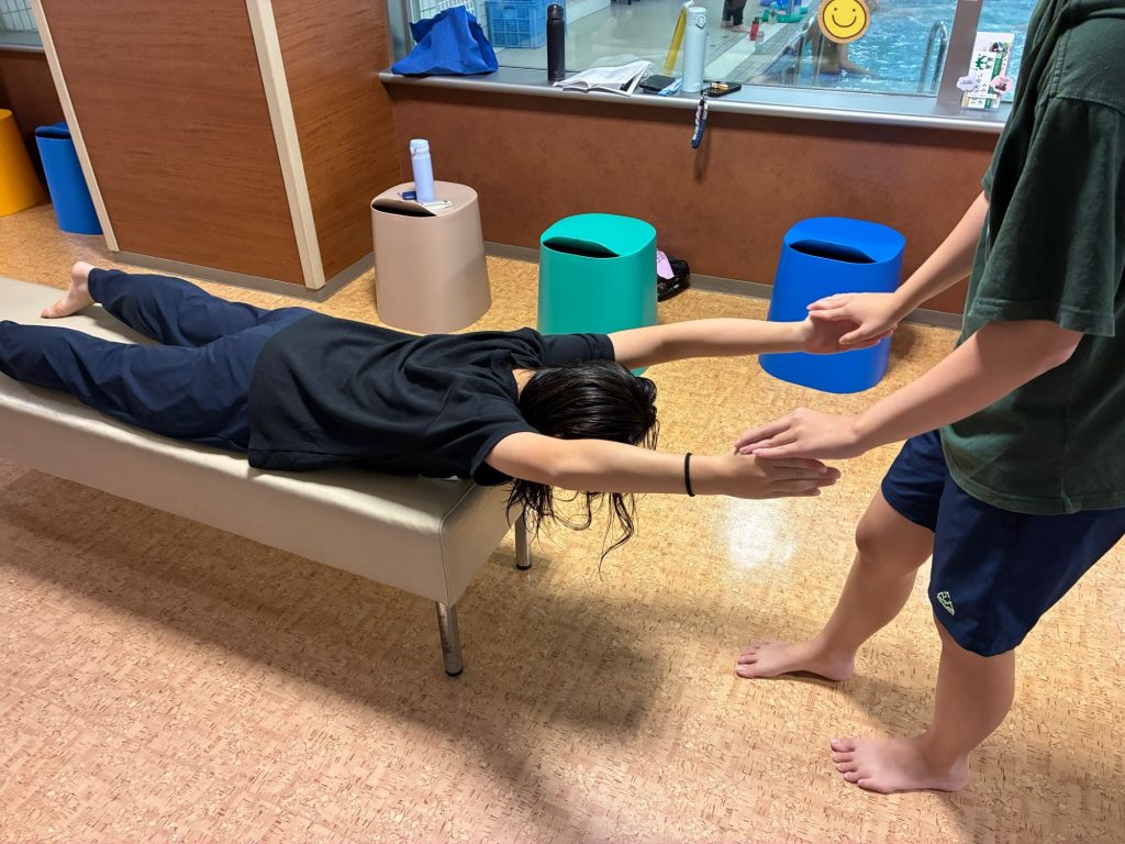 実際の競泳動作も踏まえて、左右交互に引く引き方も開始しました。