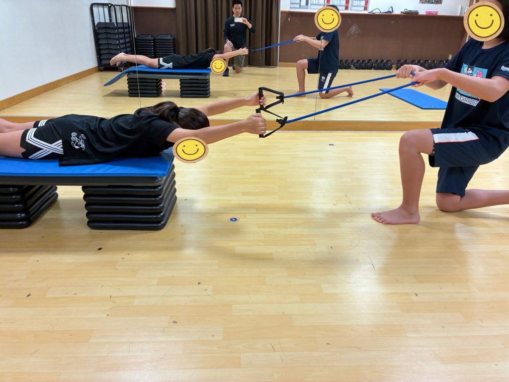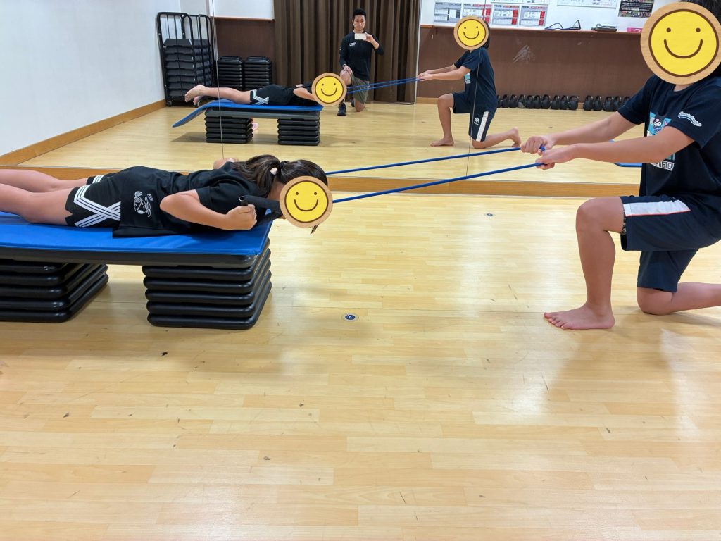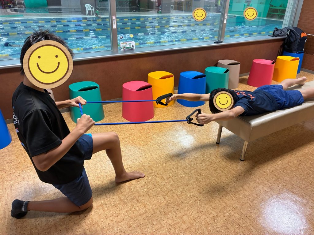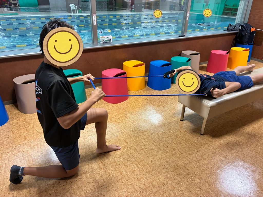 ストロークの筋力を高めるために、チューブを使った「背中」のトレーニングを進めています。