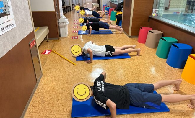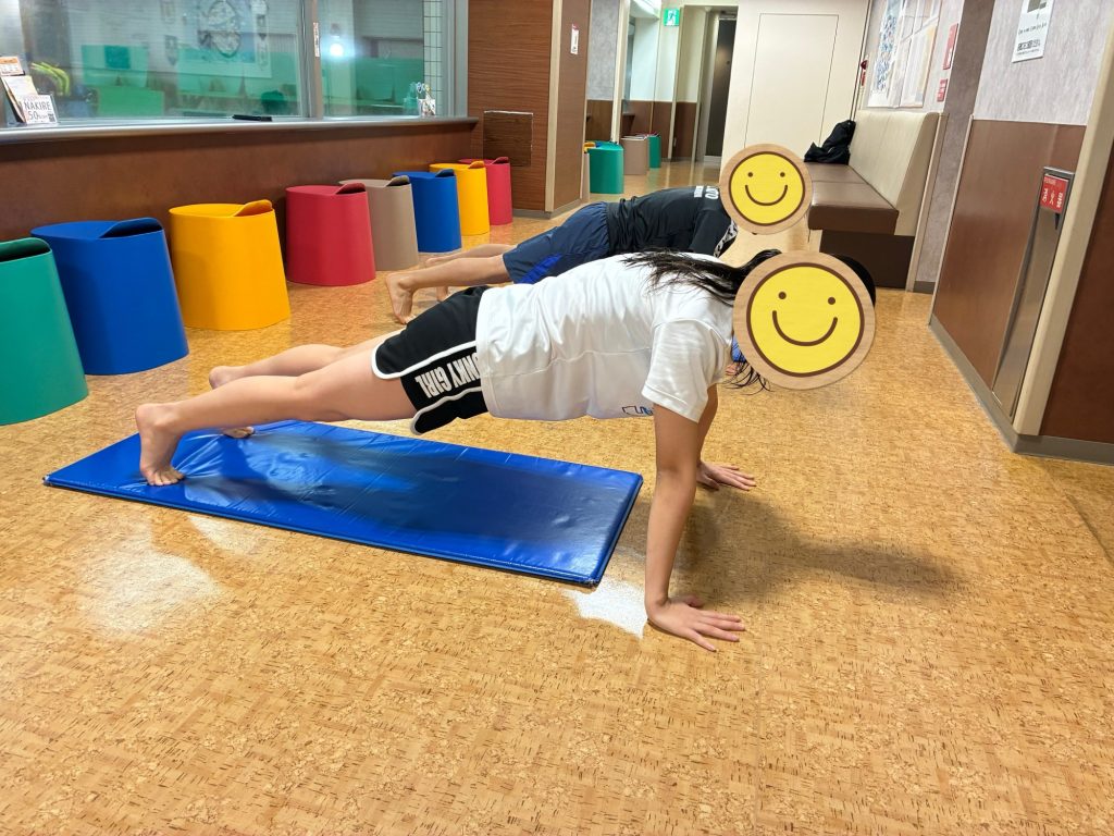 チューブトレーニングの動作が上手になって筋力が高まってきたタイミングで、今月は新たに「プッシュアップ(腕立て伏せ)」を習得してもらう月となりました。