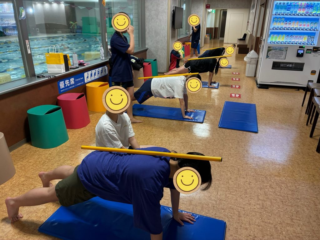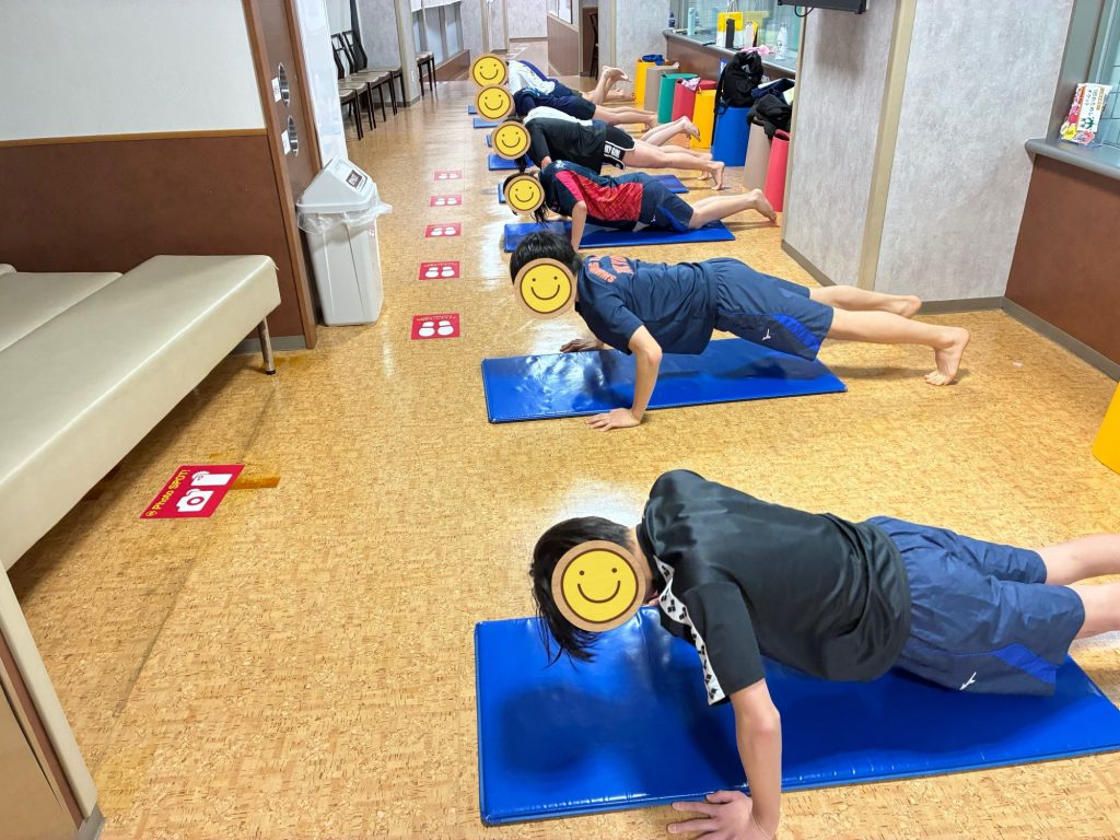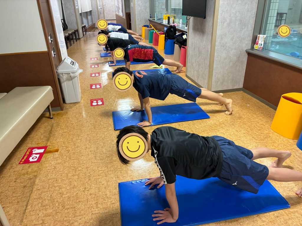 今月は、競泳動作のストローク(水中で前進するために腕で水をかく一連の動作のこと)の筋力を高めるための「プッシュアップ(腕立て伏せ)応用編」の実施が主な内容でした。