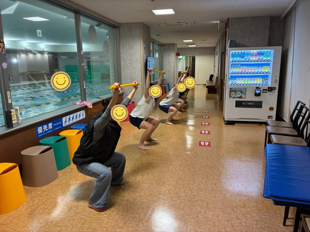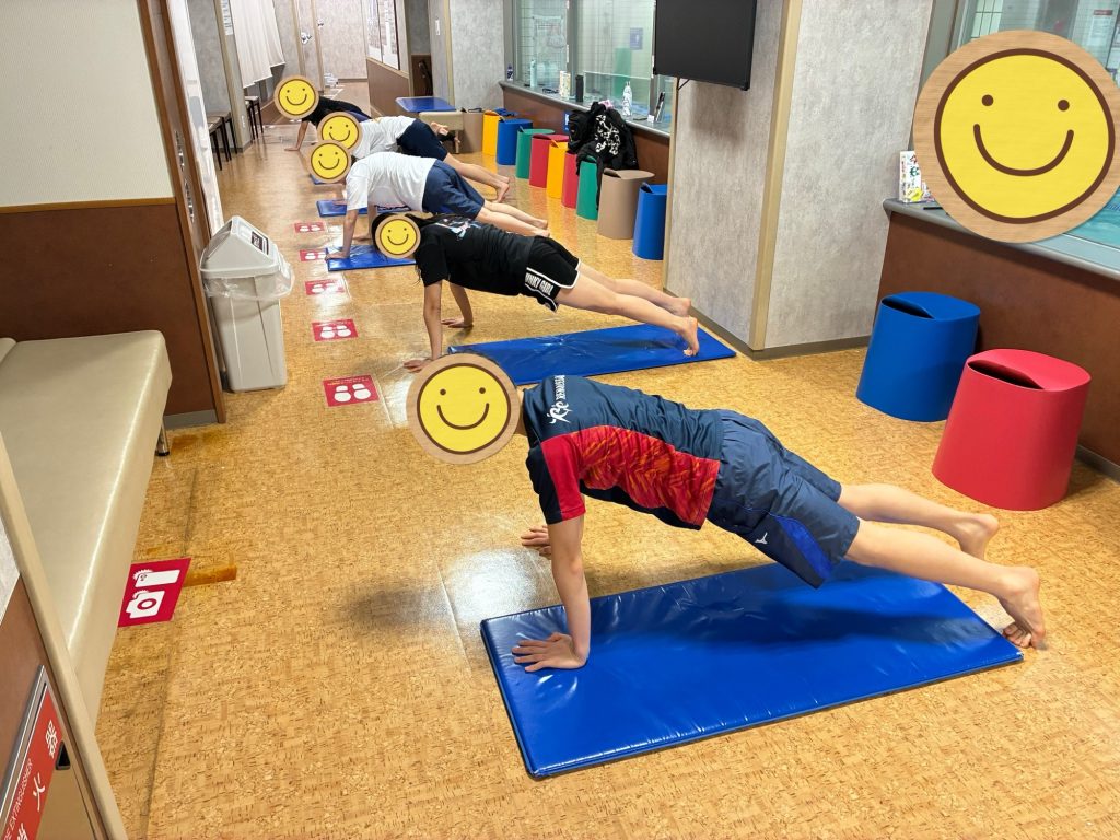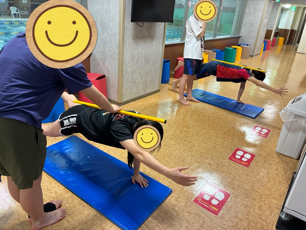 競泳動作のストローク(水中で前進するために腕で水をかく一連の動作のこと)の筋力を高めるための「プッシュアップ(腕立て伏せ)応用編」において、先月と違う種目を実施しました。